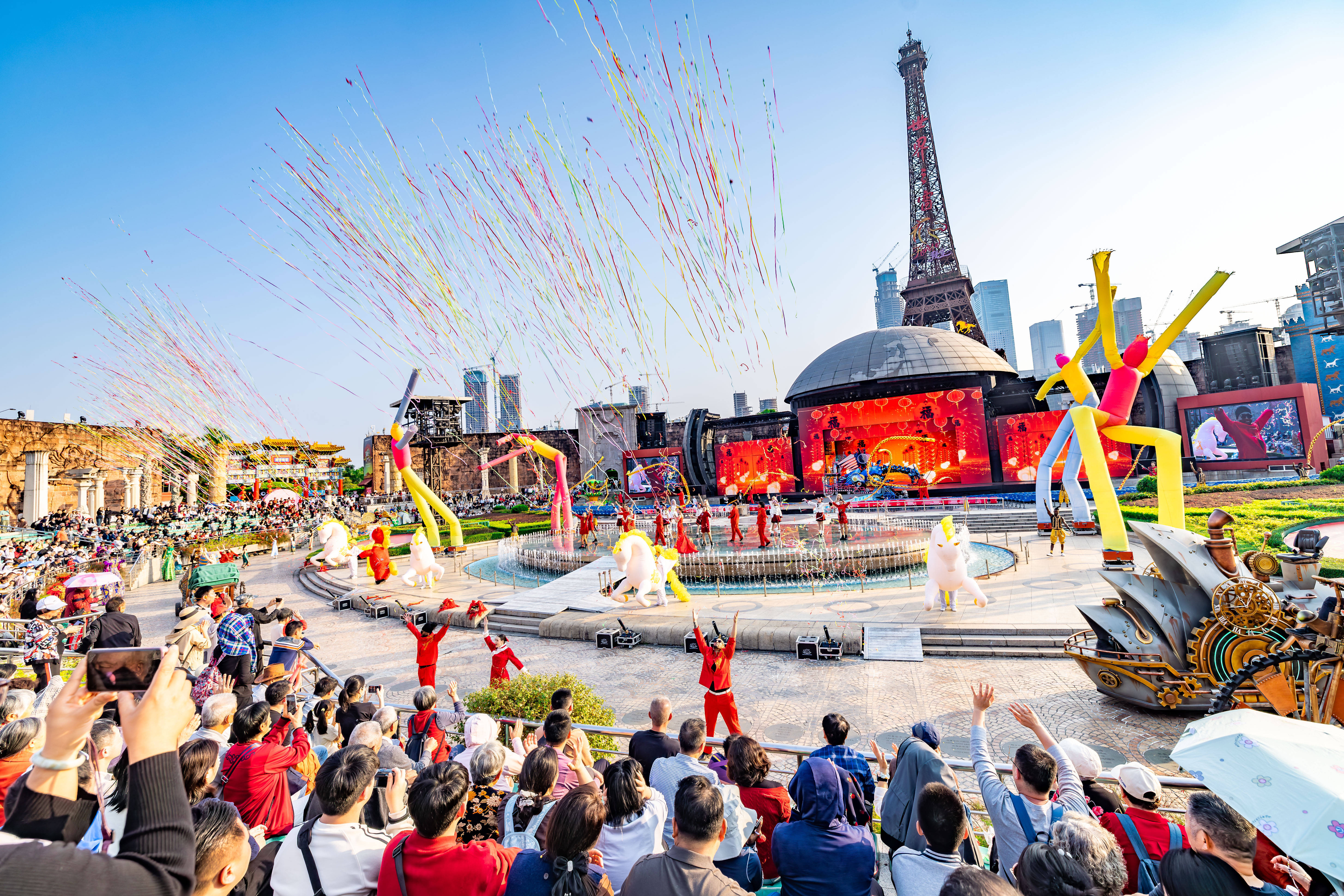 锦绣中华·民俗村利用2万平方米水域空间,全新推出《翠湖幻境》演艺活动,现场火壶钢花绚烂绽放,百米水上长龙蜿蜒盘旋,激光与威亚交织,侗族大歌与傩舞同台,让传统非遗在现代科技加持下呈现极致的视觉盛宴。与此同时,“印象中国·非遗京剧沉浸街区”让国粹走出戏台,与游客零距离互动;春晚同款机器人、机器狗加盟《非遗社火闹新春》,与英歌舞、鱼龙舞同场竞技,传统与现代的“碰撞”引得现场欢笑与喝彩不断。