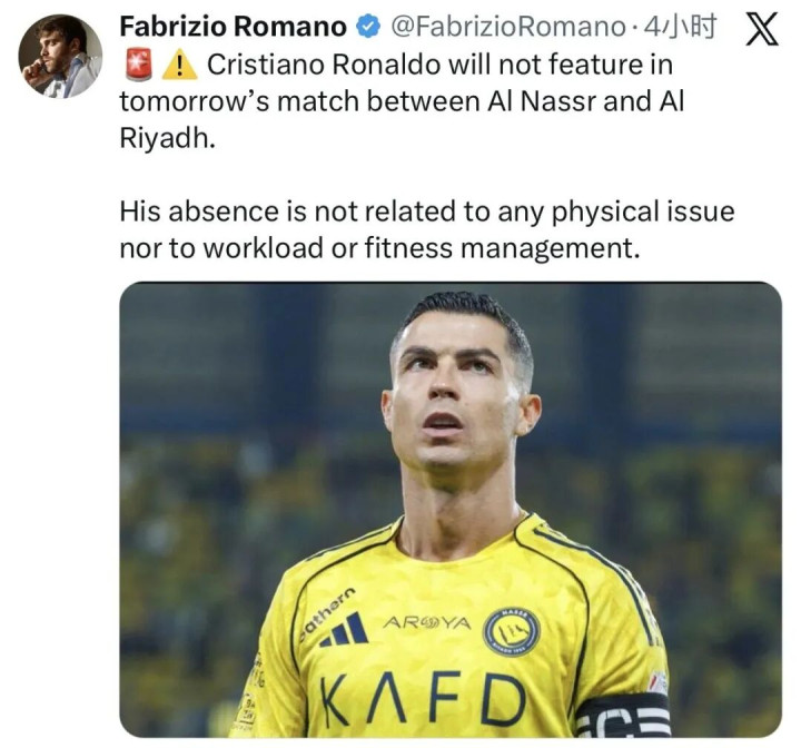 此外,罗马诺同时表示,C罗的缺席与任何身体问题、负荷管理或体能状况无关。